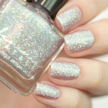 Kinbaku is a sheer grey wash with a red luminescent sheen, blue holographic microglitters and blue shifting chrome flakes. This colour will have VNL and is designed to be layered several times for a squishy, glittering finish.